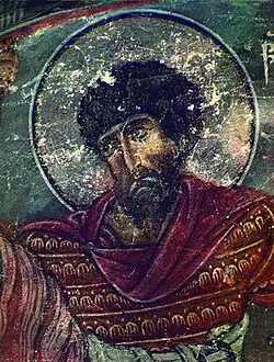 The frescoes are organized so as to follow the architectural features of the interior; various ornamental motifs are used to frame and demarcate the mural compositions. Scenes in the conch of the apse depict, in the upper and lower tiers, respectively, the Deesis and a group of church hierarchs flanked by two burning candelabra. The altar screen contains depictions of Sts. Cyricus and Julitta, Demetrius of Thessaloniki, and Stephen. The frescoes on the walls and ceiling are also arranged in two tiers, depicting the baptism of Jesus, the equestrian Saint George, the archangel Michael and Joshua, kneeling down before him, on the northern wall and the nativity of Jesus, the archangel Gabriel, the equestrian Theodore Stratelates, the Madonna Nicopeia, and Saint Anne on the southern wall.[2]
