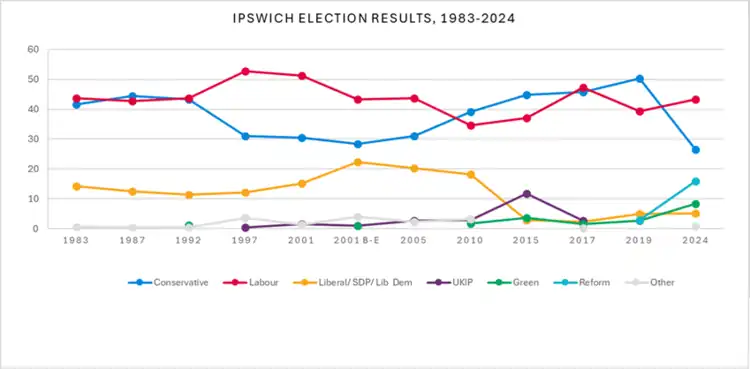 Ipswich is a marginal seat, having changed hands eleven times since its creation as a single-member constituency in 1918. It has generally been favourable to Labour Party candidates, who succeeded at every postwar general election since the end of World War II except 1970, February 1974, 1987, 2010, 2015 and 2019. It was traditionally won by either party by fairly small margins; however, from 1997 until being gained by the Conservative Party in 2010, Labour won the contests with safer margins, and after the Conservatives increased their majority in 2015, Labour regained the seat in 2017 only to lose it again in 2019 when the Conservative candidate got more than half the votes cast when there were more than two candidates for the first time since 1918. This was turned around in 2024 when Labour won the seat once again with a healthy majority of 16.8%