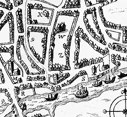 The Ipswich town rampart, reconstructed c.1200 on the line of a Viking-age defence,[32] lay in its south-eastern quarter on the east side of the Blackfriars site within the line of Lower Orwell Street. The priory lands accrued within this sector, with Foundation Street on its west side, and St Mary at Key to the south, within which parish it principally lay.[33] In 1307 Alice Harneis (wife of the leading townsman and coroner Philip Harneis, who led the group for the re-writing of the Town Custumal,[34] and to whom the town Farm was committed[35]), assigned to the friars a plot of 200 ft by 36 ft which she held from Sir Payn de Tibetot, 1st Baron Tibetot (c. 1279–1314),[36] (of the patron family of the Greyfriars[37]).[38] This required a Borough inquisition as it affected a Custom (Hadgavol) reserved to the Crown.[39]