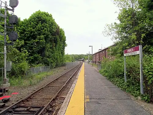 The former Boston and Maine Railroad station building was demolished by 1962.[2] Ipswich was the terminus of the line from April 1976, when the lone remaining round trip to Newburyport station was cut, until full service was restored on October 26, 1998.[3] Just south of the end of the platform are two auxiliary tracks that were used to store trains during that time.