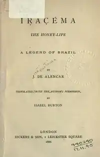 - Alencar, José de. Iracema, the honey lips: a legend of Brasil (1886) translated by Lady Isabel Burton. London: Bickers & Son. ISBN 0-85051-524-6