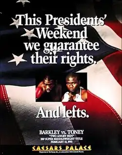Prior to the cancellation of his fight against DeWitt, Barkley confronted IBF middleweight champion James Toney at a post-fight press conference after Toney had successfully defended his title against Mike McCallum on August 29, 1992. The two men exchanged words before security stepped in to prevent the scene from escalating, though promoter Bob Arum waved the security off and allowed Barkley and Toney to continue their banter.[5] After Barkley's elbow injury healed, plans were put in motion for a Barkley–Toney fight, with the fighters first taking part in tune-up bouts on December 5, 1992, at the Trump Taj Mahal in Atlantic City, New Jersey. Barkley would defeat Robert Folley by fourth-round knockout while Toney would stop Doug DeWitt by referee technical decision, putting their super middleweight championship fight on. Chaos again ensued at the post-fight press conference with Barkley and Toney hurling epithets at each other with their respective entourages also getting into a scuffle as well. Afterwards Barkley promised that he would "ruin Toney."[6]