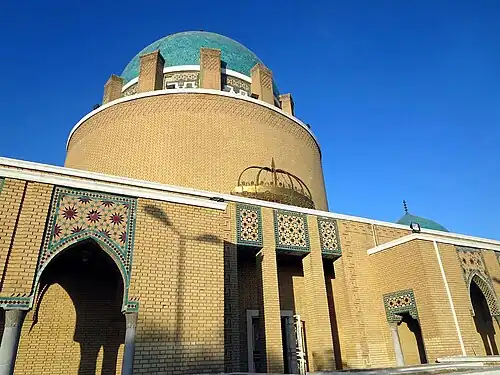 The royal cemetery is a building located in the Adhamiyah district between the Iraqi University building and the Safina area. It is surrounded by streets on all sides. It was built in the style of Islamic architecture and has three blue domes covered painted in blue livery, decorated with Islamic motifs, and distinctive architecture. The royal cemetery was built of boulder rock called "beach stone", and it was covered with bricks. The doors and windows are made of teak wood.[2][3]