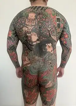 Tattooing was legalized by the occupation forces in 1948,[6] but has retained its image of criminality. For many years, traditional Japanese tattoos were associated with the yakuza, Japan's notorious mafia, and many businesses in Japan (such as public baths, fitness centers and hot springs) still ban customers with tattoos.[7] In 2020, the Supreme Court of Japan ruled that tattoos could be performed by people other than licensed medical professionals, a requirement still present in South Korea, after the home studio of an Osaka-based tattoo artist, Taiki Masuda, was raided by the police and the artist was fined. As a result, the Japan Tattooist Organization formed and created a hygiene and safety online course for artists that provides a certificate of completion, similar to practices in other countries.[8]