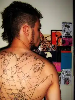 After an initial consultation during which the client will discuss with the tattooist the designs they are interested in, the work begins with the tattooing of the outline. This will usually be done in one sitting, often freehand (without the use of a stencil), which may require several hours to complete. When the outline is complete, the shading and colouring is done in weekly visits, or whenever the client has money to spare.[14] When the tattoo is finished, the artist will "sign" his name in a space reserved for that purpose, most often somewhere on the back.