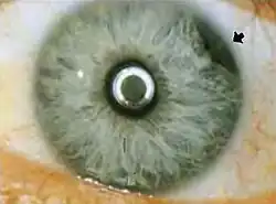 Iridodialysis is a localized separation or tearing away of the iris from its attachment to the ciliary body.[1][2]