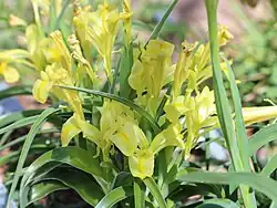 The flowers come in a range of shades of yellow, from pale yellow,[4] to soft yellow,[2] and rich-yellow.[5] The perianth tube generally is about 3 – 4.5 cm long.[3] It has falls that have a wide wing and a raised pale yellow crest, the standards are short and deflexed.[6]