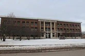 The Iron Mountain High School was constructed in 1911/12 after voters approved a $100,000 bond issue to finance a new building.[2] It was designed by D. Fred Charlton of the Marquette architectural firm of Charlton & Kuenzli. It opened in 1912 and is still in use as the district high school. It is a three-story Neoclassical structure of red brick trimmed with limestone. The center section projects slightly and contains a portico with four Roman Doric columns. Each end has a paired column portico containing a center entrance.