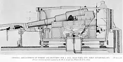 The turret was first used in naval combat on USS Monitor in 1862, with a type of turret designed by the Swedish engineer John Ericsson. A competing turret design was proposed by the British inventor Cowper Coles with a prototype of this installed on HMS Trusty in 1861 for testing and evaluation purposes. Ericsson's turret turned on a central spindle, and Coles's turned on a ring of bearings.[39] Turrets offered the maximum arc of fire for the guns, but there were significant problems with their use in the 1860s. The fire arc of a turret would be considerably limited by masts and rigging, so they were unsuited to use on the earlier ocean-going ironclads. The second problem was that turrets were extremely heavy. Ericsson was able to offer the heaviest possible turret (guns and armor protection) by deliberately designing a ship with very low freeboard. The weight thus saved from having a high broadside above the waterline was diverted to actual guns and armor. Low freeboard, however, also meant a smaller hull and therefore a smaller capacity for coal storage—and therefore range of the vessel. In many respects, the turreted, low-freeboard Monitor and the broadside sailor HMS Warrior represented two opposite extremes in what an 'Ironclad' was all about. The most dramatic attempt to compromise these two extremes, or 'squaring this circle', was designed by Captain Cowper Phipps Coles: HMS Captain. It was a dangerously low freeboard turret ship, which nevertheless carried a full rig of sail and subsequently capsized not long after her launch in 1870. Her half-sister HMS Monarch was restricted to firing from her turrets only on the port and starboard beams. The third Royal Navy ship to combine turrets and masts was HMS Inflexible of 1876, which carried two turrets on either side of the center-line, allowing both to fire fore, aft and broadside.[45]