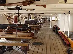 The first British, French and Russian ironclads, in a logical development of warship design from the long preceding era of wooden ships of the line, carried their weapons in a single line along their sides and so were called "broadside ironclads".[40][41] Both Gloire and HMS Warrior were examples of this type. Because their armor was so heavy, they could only carry a single row of guns along the main deck on each side rather than a row on each deck.