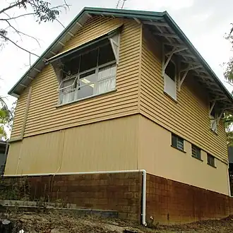 Due to a need for more space, another extension was made to the teaching building, also to a design by the Department of Public Works.[40] August Conrad Ferdinand Ohnesorgen's tender of £527 5s was accepted in December 1905 and construction was completed in 1906.[41] Attached to the end of the 1899 classroom, the extension was similar to the earlier building but was oriented at right angles and introduced further lighting and ventilation methods. It was a single-skin timber-framed building clad with weatherboards and had a gable roof. The gable end walls had packed weatherboards in the gable end apexes to vent the interior. Accommodating one classroom 34 by 18 feet (10.4 m × 5.5 m), it had a coved ceiling and tall, highset windows on all sides. The teacher's residence was also extended in 1906.[1]