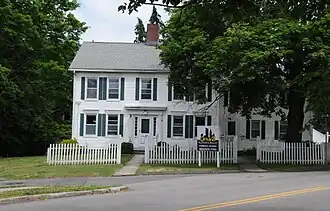 The Isaac Palmer House is located west of downtown Branford, on the north side of Main Street at its junction with Cedar Street. It is a 2+1⁄2-story wood-frame structure, with a side-gable roof and clapboarded exterior. It originally had a central chimney, which is no longer visible above the roof line. The main facade is five bays wide, with sash windows arranged symmetrically around the center entrance, each with a projecting cornice. The entrance is flanked by sidelight windows and wide Doric pilasters, and is topped by an entablature and projecting cornice. A two-story ell extends to the right of the main block, and a 20th-century garage is located at the rear of the property.[2]