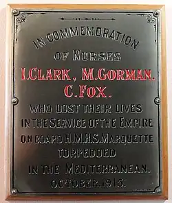 - ^ a b c d "Plaque to commemorate the Waimate Nurses who died during the sinking of the Marquette". New Zealand Museums. Archived from the original on 14 August 2016. Retrieved 27 June 2016.