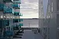 The buildings are up to ten floors tall but vary in height, with the shortest building closest to the waterfront and the tallest further back. The complex is designed and modeled after floating icebergs in the north Atlantic, both in shape and color. The buildings are divided and crisscrossed into smaller units with steep crooked roofs, to ensure that all inhabitants have ideal views of the sea. Visually, the buildings display sharp triangular edges and shifting, irregular facades. The buildings are clad in white terrazzo and have balconies made of blue glass.[2]