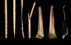 [3] numerous species now regarded as better suited to other genera: Andropogon, Andropterum, Apocopis, Arundinella, Bothriochloa, Coelorachis, Crypsis, Echinochloa, Eremochloa, Eulaliopsis, Kerriochloa, Lasiurus, Manisuris, Microstegium, Phacelurus, Pogonatherum, Polytrias, Rhytachne, Rottboellia, Sehima, Stenotaphrum, Thuarea, Triplopogon, Tripsacum, Vossia
