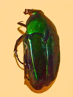 The head, the thorax and the elytra of this beetle are metallic green. The tip of the scutellum is visible.