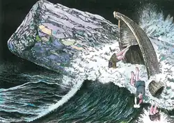 In the Japanese Folklore Institute's book Comprehensive Lexicon of Japanese Folklore, the phenomenon is explained as being the doing of a sea monster - or yōkai (Japanese: 妖怪, variously translated as "specter", "monster", "goblin") - known as the Iso Woman or some other related sea witch. This explanation is echoed in Kunio Yanagita's book Yōkai Lectures, in which Yanagita concurs that the phenomenon is best explained by some oceanic yōkai.[4] Because of this association, many experts have hypothesized that the "jo" - written in hiragana as "じょ" - actually means woman - represented by the kanji "女"[5][6] - which is the rendering used by folklorist Sakurada Katsunori in her paper Ghost Ships and Drowning People.[3] Written thus, Ishinagenjo (石投女) translates literally to "stone-throwing woman". The Kojien, on the other hand, renders "じょ" as "尉", meaning "captain" or "old man". The "stone-throwing old man" (石投尉) is likened in the text of the Kojien to an old man idly throwing stones into the sea.[7] However, yōkai expert Kenji Murakami has expressed doubts regarding the existence of any documentary evidence to visually identify the creature responsible for the phenomenon described.[6] Indeed, the Kojien notes that it is assumed that fishermen only imagine seeing a monster, but that ultimately the experience as a whole is merely an illusion.[7]