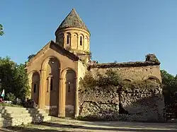 In this manuscript it is stated that Saba, the nephew and follower of the priest Gregory of Khandzta,[1] founded a monastery on the site of an earlier church. The first church built by catholicos Nerses III (641-661), who was native from the village of Ishkhan, and is also known as Nerses III Ishkhanetsi,[2][3][4] had a tetraconch plan (a central dome with four apses radiating to the cardinal points) and was presumably damaged during the Arab invasions of the 7th century. Five Georgian inscriptions within the church and on the southern facade indicate different restoration periods, from 917 until 1032. From the 12th to the end of the 14th century, large vestibules were added to the south, west and north facades. The monastery used to be one of the five patriarchates of Tao-Klarjeti and its church functioned as a cathedral until the 17th century. It was used as the headquarters for the Ottoman officers during the Russo-Turkish War in the 19th century, while its west arm was converted into a mosque and remained so until 1983. In 1987, the Ministry of Culture and Tourism (Turkey) registered İshkhhan as a national cultural monument and the site is now protected. In 2013, the Monastery was being renovated.[5]