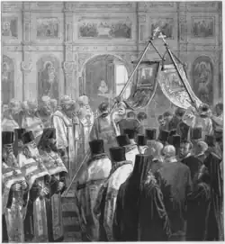 In 1840, both churches underwent repairs. The iconostases were replaced, and new images by Dmitriy Antonelli were installed.[1][5] The upper church was repainted and the painting “The Descent from the Cross” by Jacopo Bassano, originally in the private church of Grigory Orlov, was placed in it.[1][5] The churches were then re-consecrated: the upper one on 11 June 1842 by Bishop Venedict of Revel in the name of Saint Nicholas, and the lower church on 17 September 1842 by Bishop Afanasiy of Vinnytsia in the name of Holy Prince Feodor of Yaroslav.[2][3][5] In 1867 the iconostasis and the royal doors of the Feodorovskaya Church were again refurbished.[1]