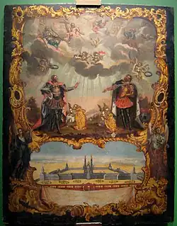 Construction of the southern wing of the monastery building, from the Holy Trinity Cathedral to the southern boundary of the monastery, began in 1725, overseen by Leonard Theodor Schwertfeger.[1] Construction stalled in 1730, and only resumed in 1741 under Pietro Antonio Trezzini.[2] The two-storey wing was finally completed under the auspices of Ivan Rossi in 1748. The south-eastern corner continued the style of the north Dukhovsky wing, and like that wing, was finished with a two-storey church, laid down on 9 August 1745, and intended to be the symmetrical counterpart of the Annunciation Church.[1][3][4] Construction of the church lasted for seven years, with further work to attach a staircase carried out between 1755 and 1761 by M. D. Rastorguev.[1][5] The decoration was completed by 1766.[2] As completed the church building contained two churches, one on the ground floor and one on the upper floor.[3] The icons were painted by Aleksey Antropov.[1] The churches were only consecrated in 1770; the upper one in the name of Holy Prince Feodor of Yaroslav, brother of Saint Alexander Nevsky; and the lower one in the name of Saint John Chrysostom.[1][2][3]