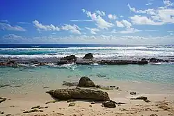 Cozumel is surrounded by a diverse ecosystem of coral reefs that is home to more than 1,000 marine species.[19] The reefs are primarily found on underwater cliffs; some exist in coastal lagoons and on sand bars at the north tip of the island.[20] These reefs are part of the much larger Mesoamerican Barrier Reef System, which is the second largest reef in the world, stretching over 1,000 kilometers (620 mi).[21] Cozumel's deeper coral reefs were historically famed for their black corals,[22] yet black coral populations declined from the 1960s to the mid-1990s because of overharvesting[22] and by 2016 had not recovered.[23] A large portion of the reef on the south side of the island is sectioned off into the Arrecifes de Cozumel National Park. This park is protected under the Ramsar Convention along with Manglares y Humedales del Norte de Isla Cozumel; they both are included in the UNESCO protected area called Isla Cozumel Biosphere Reserve, Mexico.[24] The reefs in Cozumel are made up of hard coral and soft coral. The marine life that inhabit the reefs include zoanthids, polychaetes, actinarians, hydroids, sponges, crustaceans, mollusks, echinoderms, and many varieties of Caribbean fish. The park is also a habitat to several endangered marine species such as the loggerhead sea turtle, hawksbill sea turtle, queen triggerfish, and the endemic splendid toadfish.[25] Due to the abundant marine life and coral reefs, as well as the clear and warm Caribbean water, Cozumel is considered one of the best scuba-diving destinations in the world.[26]