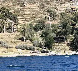Isla del Sol (Spanish for "Island of the Sun") is an island in the southern part of Lake Titicaca. It is part of Bolivia, and specifically part of the La Paz Department. Geographically, the terrain is harsh; it is a rocky, hilly island with many eucalyptus trees. There are no motor vehicles or paved roads on the island. The main economic activity of the approximately 800 families on the island is farming, with fishing and tourism augmenting the subsistence economy. Of the several villages, Yumani and Challapampa are the largest.[1]