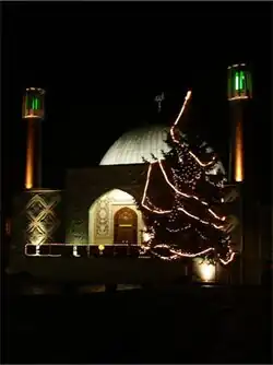 Local authorities in Hamburg initially opposed the construction of a mosque, particularly as the plot chosen by the committee was zoned as green space.[10] Additionally, building codes made the extravagant blue exterior difficult to realize. These issues were however resolved due to political goodwill by Paul Nevermann and Kurt Braasch towards the Iranian community.[18] This change of opinion in the city government can largley be attributed to Shah Mohammad Reza Pahlavi's intervention on behalf of the Iranian community in Hamburg related to his upcoming 1967 state visit.[19] Construction eventually began once the organization's first director, Ayatollah Mohagheghi, arrived in Hamburg. The building's cornerstone was laid by Mohagheghi at the Shah's request on 13 February 1961. In 1963, Mohagheghi's return to Iran due to the aforementioned financial troubles halting construction.[19] It resumed in 1964 and in 1966 most of the mosque's tile work was finished under the supervision of Mohammad Bagher Ansari and financed by private donations from Hamburg and Tehran. The mosque officially opened on 8 February 1966.[20]