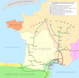 The 719 Umayyad invasion of Gaul was the continuation of their conquest of the Visigothic Kingdom of Hispania. Septimania, in southern Gaul, was the last unconquered province of the Visigothic Kingdom.[1] The incursion into Septimania was motivated by the need to secure their northern Iberian gains. Muslim armies began to campaign in Septimania in 719. After the fall, in 720, of Narbonne, the capital of the Visigothic rump state, Umayyad armies composed of Arabs and Berbers turned north against Aquitaine. Their advance was stopped at the Battle of Toulouse in 721, but they sporadically raided the southern half of Gaul as far as Avignon and Lyon.[1]
