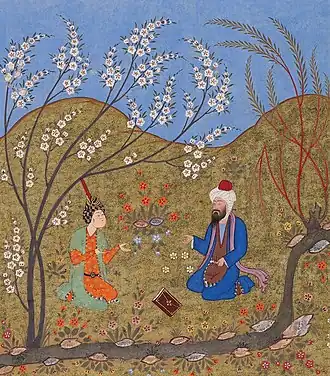 Persians played a huge role in developing and systematising Islamic mysticism. One of the first to formalise Sufi principles was Junayd of Baghdad – a Persian from Baghdad.[119] Other great Persian Sufi poets include Rudaki, Rumi, Attar, Nizami, Hafez, Sanai, Shamz Tabrizi and Jami.[120] Famous poems that still resonate across the Muslim world include The Masnavi of Rumi, The Bustan by Saadi, The Conference of the Birds by Attar and The Divān of Hafez.