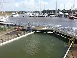 To stay in the deepest water, yachtsmen should steer straight for the green navigational buoy immediately off of the marina's holding pontoon. A 90 degree turn to port just before it, will take vessels parallel to the pontoon and into/through the lock. Yachtsmen should be beware of the mudbanks either side of the entry channel and stay within the channel markers.[5]