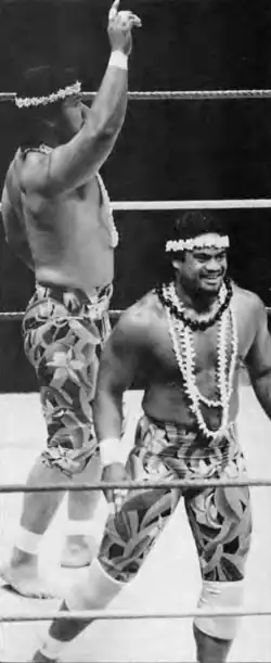 "High Chief" Afi joined the tag team to make a trio for one episode of WWF Superstars of Wrestling, taped April 21, 1988 and aired on May 7, 1988.[2] However, the trio would not last long. Tama's last match with the WWF took place on April 24, 1988 in Toronto's Maple Leaf Gardens and Haku and Afi would wrestle only a small number of matches through May as the Islanders before Afi was released. Haku stayed in the WWF for several more years afterwards as both a single and tag team wrestler.[6]
