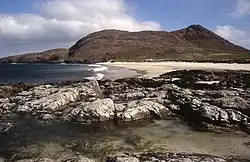 In common with the rest of the Western Isles, Barra is formed from the oldest rocks in Britain, the Lewisian gneiss, which dates from the Archaean eon. Some of the gneiss in the east of the island is noted as being pyroxene-bearing. Layered textures or foliation in this metamorphic rock is typically around 30° to the east or northeast. Palaeoproterozoic age metadiorites and metatonalites forming a part of the East Barra Meta-igneous Complex occur around Castlebay as they do on the neighbouring islands of Vatersay and Flodday. A few metabasic dykes intrude the gneiss in the east.[9] The island is traversed by a handful of normal faults running WNW-ESE and by west-facing thrust faults bringing nappes of gneiss from the east. Blown sand masks the bedrock around Borve and Allisdale as it does west of Barra airport. Peat deposits are mapped across Beinn Chliaid and Beinn Sgurabhal in the north of the island.[10]