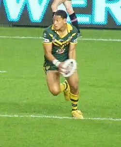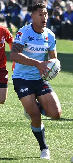 In 2011, Folau joined the Greater Western Sydney Giants in the Australian Football League (AFL) and played for two seasons. In December 2012, Folau announced he was to switch codes again, this time for rugby union, and signed a one-year contract with the Waratahs.[9] He would later become the record holder for the most tries scored in Super Rugby history post the 2019 season.[10] At international level, he made his debut for Australia in 2013 against the British & Irish Lions, and went on to earn 73 caps. In 2022, Folau switched allegiance in order to represent Tonga after World Rugby announced its new eligibility laws.