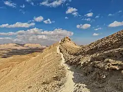Leaving the city, the route passes into The Negev Desert. It goes over Mount Qina, and then along the river of Nahal Kanfan. Much later, it passes through the Roman archaeological site of Mezad Tamar. Heading south, it reaches an observation point on the rim of HaMakhtesh HaKatan, the first of the three Makhtesh the trail sees; it passes through and comes close to the gap (centre).