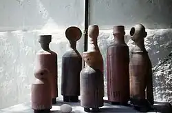 Many of the artists sought to probe the personal and the biographical through archetypal images, and thus express the symbolic dimension of art. From the point of view of form, it was manifested by developing means of sculptural expression in a more figurative direction and with a tendency toward ignoring the individual object in favor of the sculptural array.[61] Siona Shimshi, for example, developed her ceramic sculpture as a series of archetypal human forms made of bare material.[62] Nora and Naomi began to communicate with the sculptural field when they started to make use of motifs of journeys or nature images. The works of Moshe Shek are somewhere on the spectrum between ceramics and sculpture, expressed in a sort of postmodern incarnation of the Israeli ceramic tradition. The enormous pieces he created, which he called "containers" (1986), were decorated with simple designs that emphasized the natural colors of the material,[63] and these sculptures displayed stylized imaginary animals made of clay cylinders that emanated echoes of "Canaanite" sculpture. Other artists, such as David Morris and Mark Yudell, used images specifically in order to create a private mythological world, which reflected their personal experiences, along with a dollop of humor and irony.