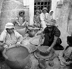 Pots were thrown on potter's wheels mostly in urban areas or in pottery villages. It was a craft traditionally worked by men. In the census carried out on the streets of the land of Israel in 1928 during the British Mandate, 77 pottery villages (of individuals or groups) were listed, while in the 1931 census, 211 different pottery villages were listed.[2] Many of the pottery villages were centralized, based on geographical proximity of the potters' families. Examples of this can be found in the pottery workshops held in the pottery villages in Rashia al Fakhar (Tel Faher) at the foot of Mount Hermon.[3] Or in Hebron, at the various workshops of the Alfahori family. These pots were fired at a low temperature in traditional kilns that burned wood, charcoal, or animal droppings. Different workshops were held in Gaza as well, where they produced unique black pottery (فخار اسود), produced by adding organic materials, such as barley husks, to the kiln or by reduction firing. The smoke from the process of the burning of these materials within the kiln lent the pottery its characteristic black color.[4]