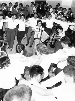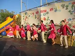 Israeli folk dance (Hebrew: ריקודי עם, romanized: rikude ʿam, lit. 'folk dances') is a form of dance usually performed to songs in Hebrew, or to other songs which have been popular in Israel, with dances choreographed for specific songs. Israeli dances include circle, partner and line dances.[1] As almost all dances are intentionally choreographed. The choreographers are known and attributed, the reference to these dances as "folk dances" is sometimes controversial among the general folk dance community. The recent trend of dances becoming more complex and "professional" has led some to use the alternative term "Recreational Israeli Dancing."