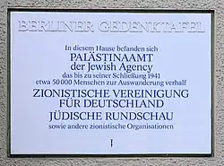 From January 1939 on the editorial offices of Jüdisches Nachrichtenblatt were located in Meinekestraße 10, Berlin, formerly used by the Jüdische Rundschau. The new paper was restricted to announce public orders and new restrictions and organisational changes as well as to promote emigration.[15] In January 1939 Nova, a company of so-called Aryan owners, bought the Buchdruckerei und Verlagsanstalt Max Lessmann. On 21 March 1939 Alfred Japha, the proprietor, had to sell his house Lindenstraße 69 to the Papiergroßhandlung Ferdinand Flinsch, a paper wholesales company and proprietor of the neighboured house Lindenstraße 70. Also Japha counted as Jew according to the Nuremberg Laws.[16]