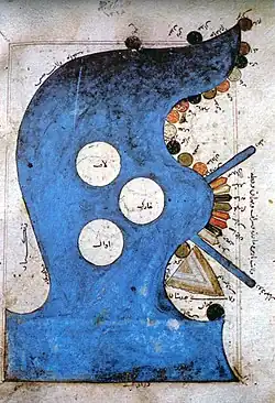 - Masālik al-Mamālik (مسالك الممالك, Routes of the Realms), or Kitab al-masalik wa-l-mamalik (كتاب المسالك والممالك Book of Roads and Kingdoms), a contribution to the "Book of Roads and Kingdoms" tradition. This combines maps with descriptive text to describe the geography of Iran and surrounding kingdoms. It is based mainly on lists of stations of postal routes, and seems intended to help commit those lists to memory rather than to guide travellers through the territory. There is no consistency between the map projections. An illuminated manuscript (MS Or. 3101) dated AH 589 (AD 1193) is held by Leiden University Libraries and is digitally available.[6] Another illuminated manuscript dated AH 706 (AD 1306–07) now resides in the Khalili Collection of Islamic Art. It contains many maps, though some mentioned in the text are missing.[7]