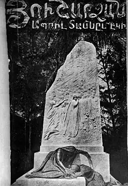 After the first commemoration, plans were implemented to build a monument dedicated to the victims of the genocide. A committee was formed to carry out the project. It was eventually erected in 1919 and was located on the premises of the Pangaltı Armenian Cemetery. The cemetery, which was to be later demolished and confiscated by the Turkish government in the 1930s, was located in today's Gezi Park near the Taksim Square in Istanbul.[2] The monument became the first memorial dedicated to the victims of the Armenian Genocide.[3]