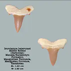 | Isurolamna bajarunasi | Known mainly from the Mid-Late Eocene (Bartonian-Priabonian) of Kazakhstan, this species is more robust than I. inflata but less so than I. gracilis. It is likely a transitional species between the two. "Lamiostoma" menneri is a junior synonym. | ![]() |