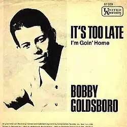 "It's Too Late" was a record for Bobby Goldsboro. It was released in 1965 and became a hit the following year in both the United States and Canadian charts.