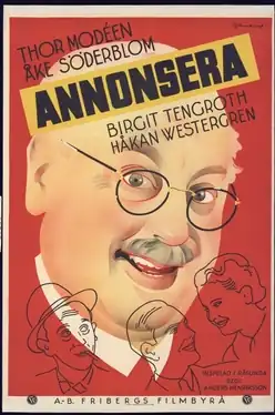 It Pays to Advertise or simply Advertise! (Swedish: Annonsera!) is a 1936 Swedish comedy film directed by Anders Henrikson and starring Thor Modéen, Håkan Westergren and Birgit Tengroth.[1] The film was shot at the Råsunda Studios in Stockholm and its sets were designed by the art director Arne Åkermark. It is based on the 1914 Broadway play It Pays to Advertise by Roi Cooper Megrue and Walter Hackett, previously adapted into the 1931 American film of same title starring Carole Lombard.