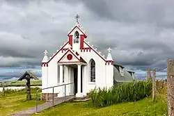 The Italian Chapel is a highly ornate Catholic chapel on Lamb Holm in Orkney, Scotland. It was built during the Second World War by Italian prisoners of war, who were housed on the previously uninhabited island while they constructed the Churchill Barriers to the east of Scapa Flow. Only the concrete foundations of the other buildings of the prisoner-of-war camp survive. The chapel was not completed until after the end of the war, and was restored in the 1960s and again in the 1990s. It is a popular tourist attraction, and a Category A listed building.[1][2]