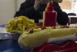 An Italian hot dog is a type of hot dog popular in New Jersey, United States, made by Jimmy Buff and his wife Mary Racioppi.[1] His family continues the restaurant Jimmy Buff's to this day.[2] Other restaurants like Joe Joe's Italian Hot Dog in Toms River serve Italian hot dogs but Jimmy Buff's is nonetheless most widely known in New Jersey as the restaurant that first served Italian hot dogs and is most famous for their Italian hot dog.[3]