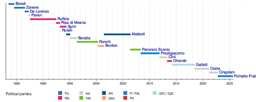 The current office holder is Gilberto Pichetto Fratin, a member of Forza Italia, who is serving in the government of Giorgia Meloni since 22 October 2022.[1]