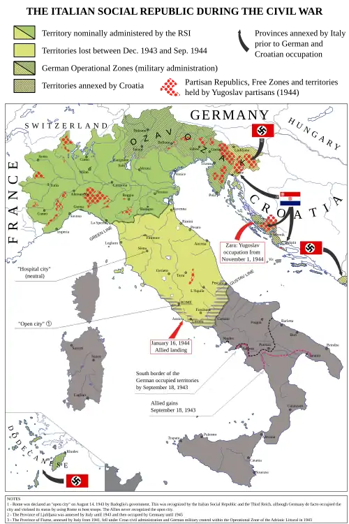 - ^ Both OZAV and OZAK were still formally part of the RSI. But the two regions were put under direct German military administration.