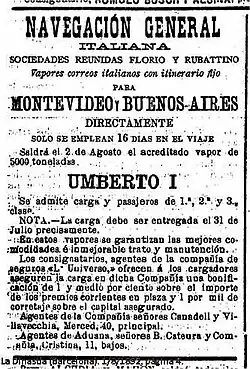 Already in the 19th century relations began between Uruguay and the Kingdom of Piedmont-Sardinia, which signed some commercial and navigation treaties.[15] After the revolutions of 1820 and of 1830 in Italy, some revolutionaries fled to America from Piedmont, the Papal States and the regions of Southern Italy.[16] The number of immigrants began to increase starting from 1830, after the obstacles imposed on immigration that were in place during the colonial era were eliminated;[17] this also coincided with the political situation in Argentina, which prevented immigration.[18]
