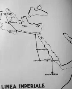 Italians also created new airports and in 1936 started the worldwide famous Imperial Line, a flight connecting Addis Ababa to Rome. The line was opened after the Italian conquest of Ethiopia and was followed by the first air links with the Italian colonies in Italian East Africa, which began in a pioneering way since 1934. The route was enlarged to 6,379 km and initially joined Rome with Addis Ababa via Syracuse, Benghazi, Cairo, Wadi Halfa, Khartoum, Kassala, Asmara, Dire Dawa.[14] There was a change of aircraft in Benghazi (or sometimes in Tripoli). The route was carried out in three and a half days of daytime flight and the frequency was four flights per week in both directions. Later from Addis Ababa there were three flights a week that continued to Mogadishu, capital of Italian Somalia.