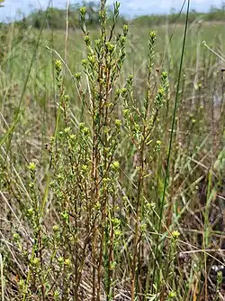 Iva microcephala is a wind-pollinated annual herb sometimes as much as 100 cm (40 inches) in height. Leaves are very narrow, sometimes thread-like, up to 6 cm (2.4 inches) long. Flower heads are small, clustered in elongated arrays at the tips of branches, each head containing only about 5-8 flowers.[3]